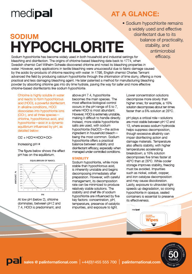 In conclusion, sodium hypochlorite remains a widely used and effective disinfectant due to its balance of practicality, stability, and antimicrobial efficacy. Its historical development and chemical behaviour highlight the importance of managing pH, concentration, and environmental conditions to optimise performance.