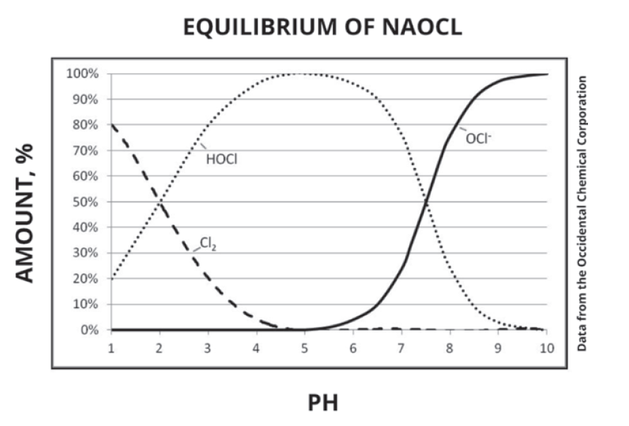 At low pH (below 2), chlorine dominates; between pH 2 and 7.4, HOCl is predominant; and above pH 7.4, hypochlorite becomes the main species. The most effective biological control occurs in the pH range of 5 to 7,